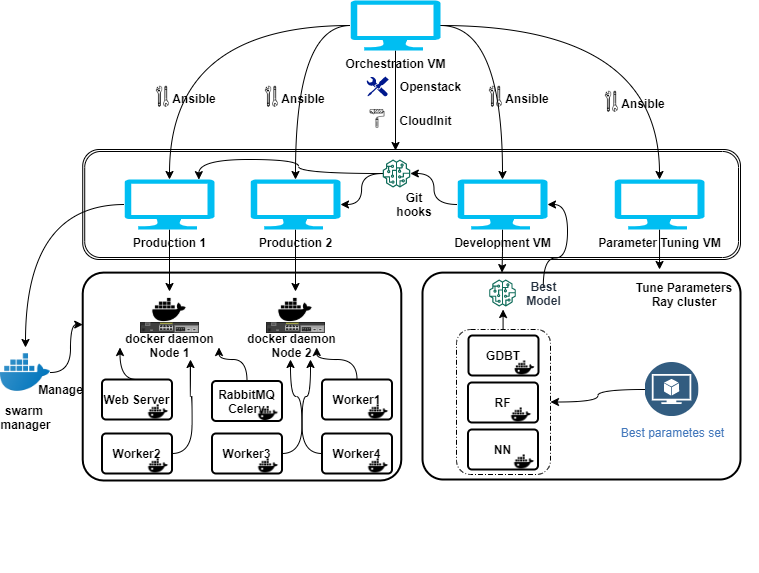 In order to facilitate the reproduction and management of the project, we have automated and orchestrated mostof the steps of the project. Generally speaking, Openstack API is responsible for the automation of creatinginstances on Openstack and configuring their basic environment, Ansible is responsible for managing andmonitoring the VMs, the Ansible playbook is responsible for automatically configuring the detailed operatingenvironment and running programs of each instance, the CI/CD technology(git hook) is used to realize theautomatic push of the latest models to the production server. Most of the configurations including ci/cd areorchestrated by Ansible. Jupyternotebook is used to help to edit the code. Part of the construction of Raycluster and Swarm cluster is also completed automatically by Ansible. But some other settings of the clustersneed to be done manually.